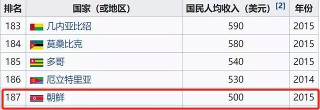 根据世界银行提供的数据,朝鲜在 2015 年人均年收入约 500 美元,大约就是 3000 多人民币。
