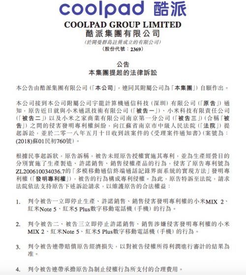 2018年年初,酷派就一纸状书将小米等告上了法庭,几个被告主体包括小米通讯、小米科技、小米之家以及深圳天达通讯,称他们在生产、许诺销售、销售侵权产品方面侵害了原告三项发明专利,给其造成了严重的经济损失。