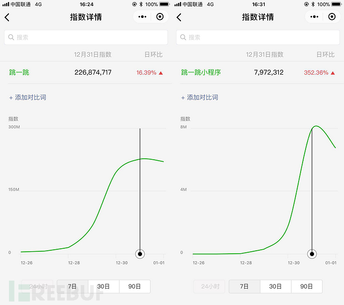 从2017年12月28日下午正式上线之后,“跳一跳”微信指数几乎直线上升超过2亿,恰逢元旦三天假期,热度持续走高。随即全网出现各种“跳一跳”上分攻略以及辅助。