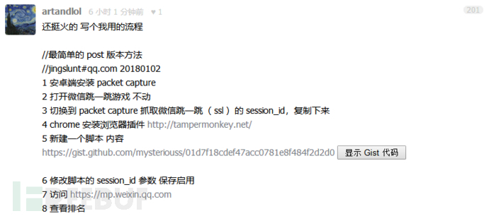 不过很快微信官方元旦当天深夜就修复了这个漏洞,但微信跳一跳源码已经外泄,而且很快新的抓包方式就出现了。在笔者截稿前,也就是2018年1月2日下午,仍然有不少人利用放出的源码成功POST刷分。看来微信小程序在安全性上还没有做到足够完善。