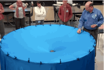起伏,震颤,波浪……你可以用各种各样的词形容你在上图看到的“时空扰动”。这种变化以波的形式向外传播,用听起来很厉害的说法讲,就是“引力波”,换文艺点的说法讲,就是“时空的涟漪”。