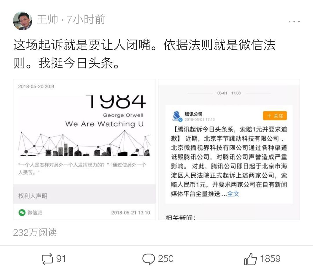 “我挺今日头条。”一石激起“阿里浪”,阿里巴巴集团市场公关委员会主席王帅通过社交媒体表示:“这场起诉就是要让人闭嘴。依据法则就是微信法则。我挺今日头条。”