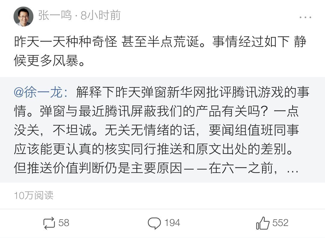 今日头条总编辑徐一龙在社交媒体发文解释了“弹窗新华网批评腾讯游戏”事件:要闻组值班同事应该能更认真地核实同行推送和原文出处的差别。但推送价值判断仍是主要原因——在六一之前,重要央媒对游戏和一个大互联网公司的批评,是重要的事情。