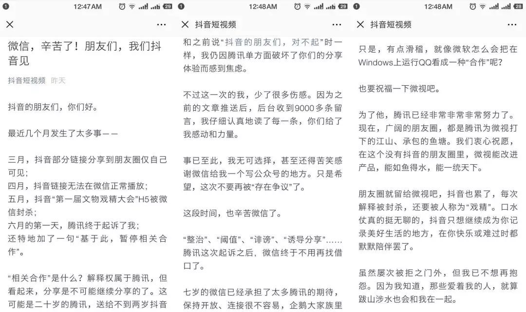 今日头条方面通过微信公众号“抖音短视频”发布文章立刻做出反击。该文章标题为《微信,辛苦了!朋友们,我们抖音见》,文章写到: