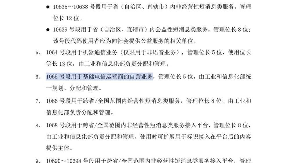 这份工信部 2017 年版的《电信网编号计划》,解释了 1065 号段和 1069 号段是怎么区分的。