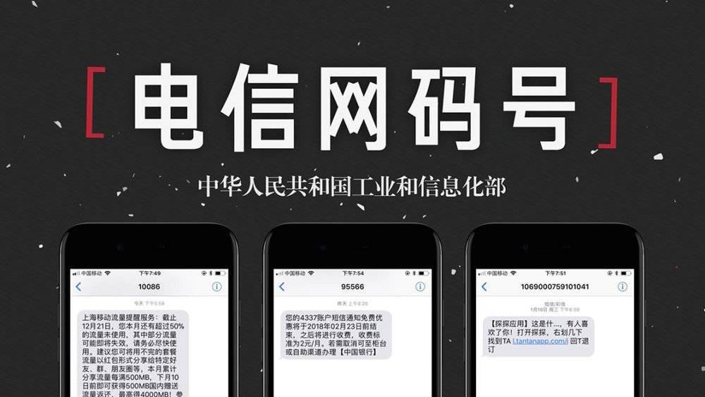 无论是 10086、95566 还是 10690,这些号段都叫做“电信网码号资源”,由工信部统一管理审批。能开放给私营企业群发短信的,只有 1065 和 1069。