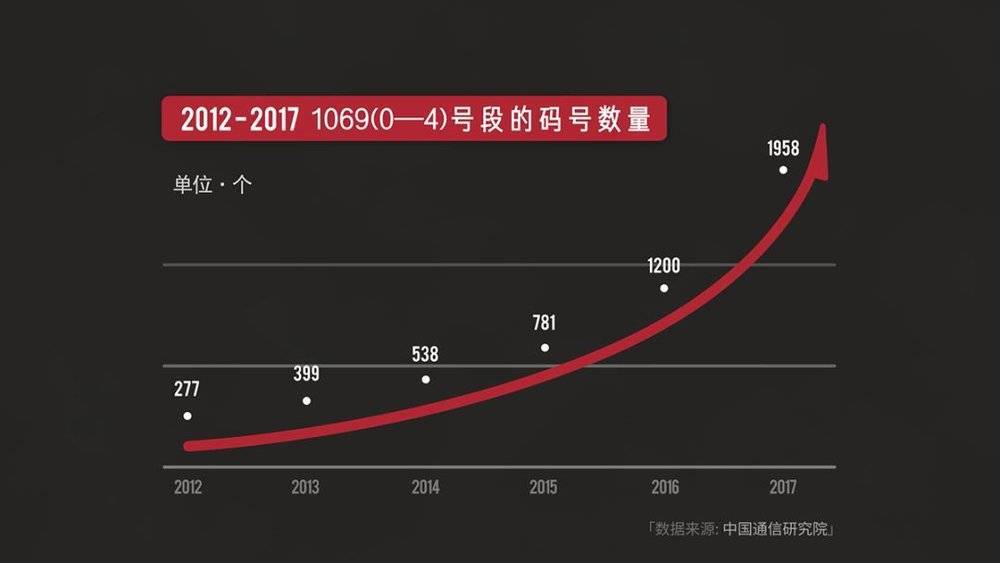 在其他路都被逐渐堵死之后,1069 号段是唯一出路,搞短信群发的也不得不开始转型。到 2017 年 9 月,1069(0-4) 号段的码号已经有 1958 个,是 5 年前的 7 倍。
