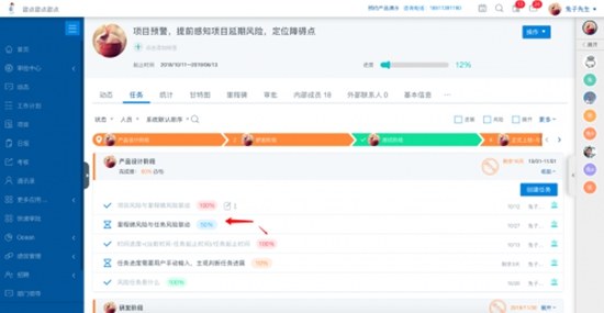 针对研发、工程类等长周期的项目推出“风险预警体系”,依据任务进度,系统计算出项目风险值,给到管理者参考建议。精准定位项目障碍,让项目管理更智能,不得不说,这么专业的项目管理,是很多同类型软件无法企及的。