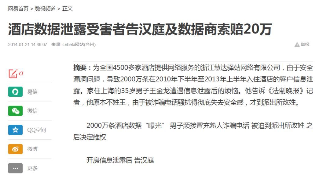 2014年时,上海的王金龙把汉庭(华住前身)告上法庭,就是因为怀疑个人信息被泄露。