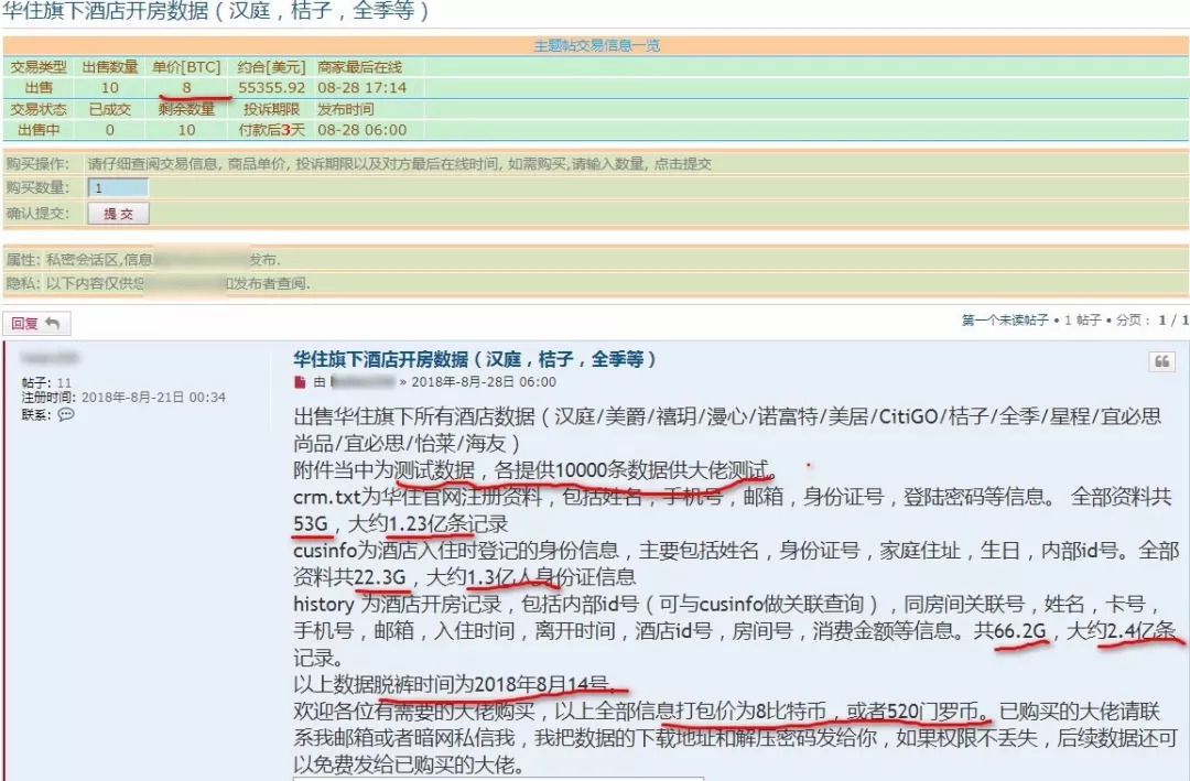 昨天,一张截图惊爆网络,华住集团旗下连锁酒店近5亿条用户数据被人放到一个神秘论坛上贩卖了。