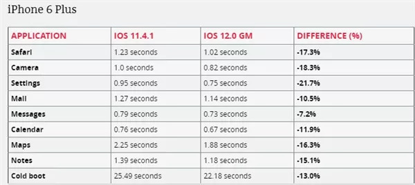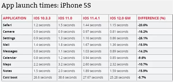 在iPhone 5s上,无论是Safari浏览器、相机、设置、邮件、短信、日历、地图、备忘录、冷启时间等,均比iOS 11.0/11.4.1要快,用时最高可缩短26%。即便是对比iOS 10.3.3,也能在一半的APP中取得优势。