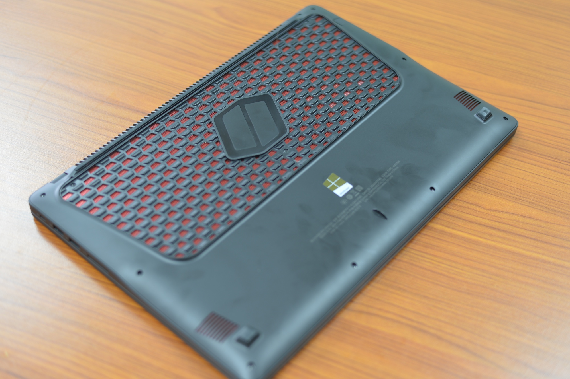 在D面,玄龙骑士采用了一整块的龙麒麟散热设计。这个所谓的设计其实龙鳞造型的散热孔,离远看是一大片黑色和红色相间的区域,黑色部分向外斜向凸起。红黑配色与整机的设计非常吻合,同时也更具神秘感。