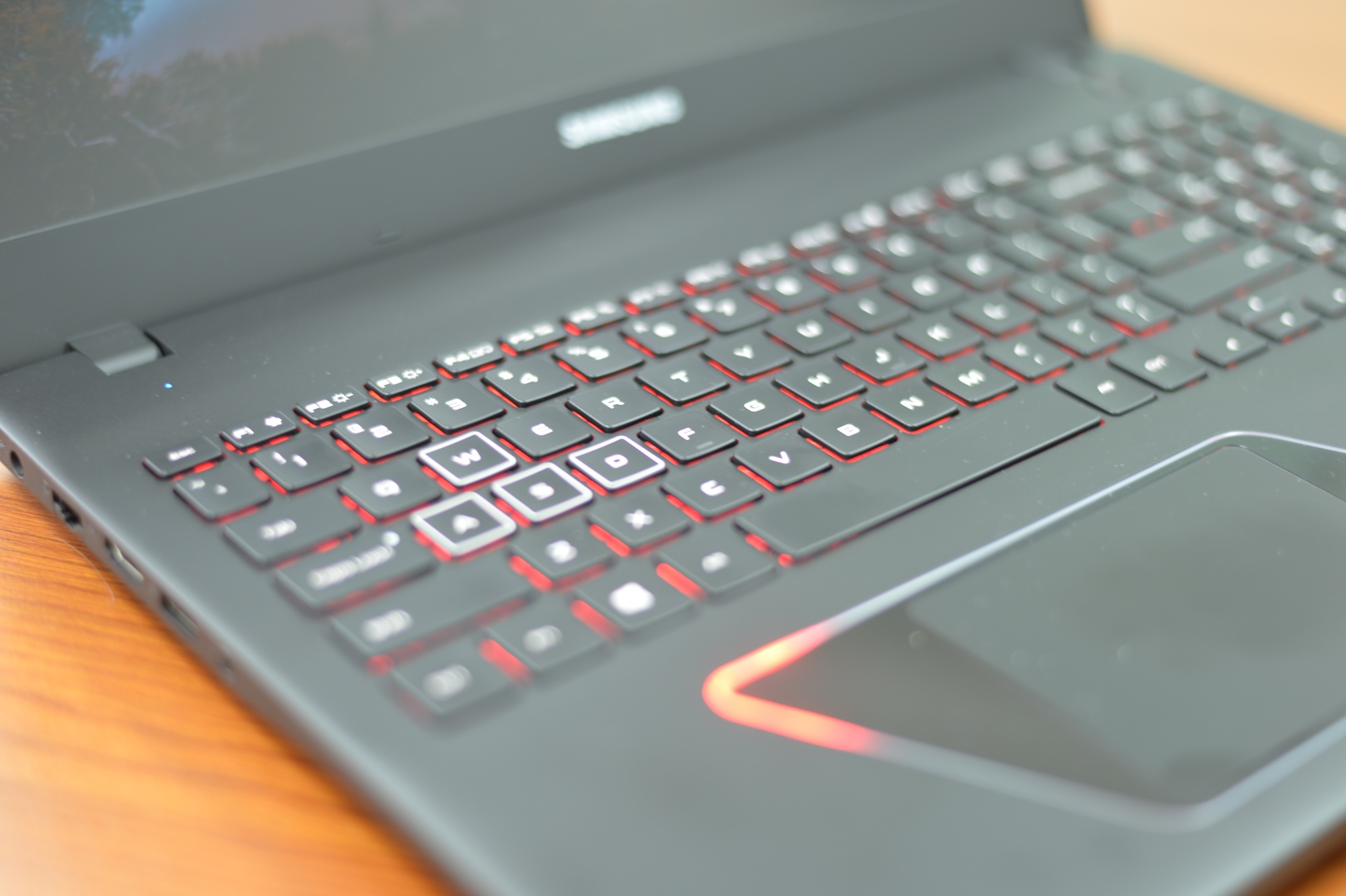 机身正面的红色logo就如同是龙的眼睛,这也是整个游戏本的名称由来。这个元素在笔记本的触摸板上也再一次地现身。顶盖除了Logo之外还设计有流线线条,这更能体现游戏本所需要有的动感。