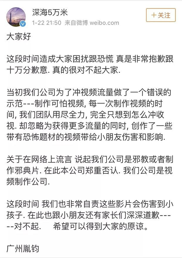 而在国内一众上传和制作相关视频的账号中,“欢乐迪士尼”是最引人注目的账号之一,其微博认证信息是“广州胤钧贸易有限公司”。在儿童邪典视频事件曝光后,该公司于 1 月 22 日发表了道歉声明,解释制作这类视频的用意“冲流量”,微博名称也改成了“深海5万米”。