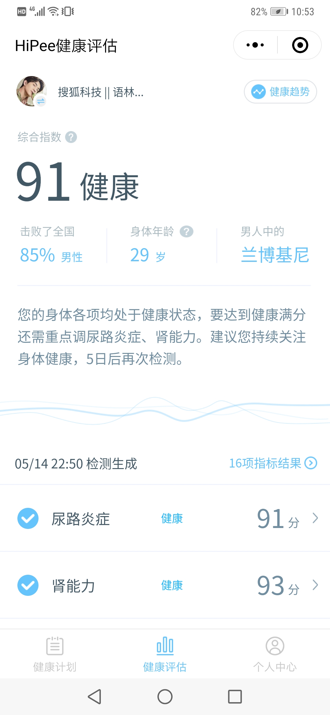 对最近几次的检测数据还可以生成健康评估报告,给你打分,各项能力分数是由个人部分信息、专业的硬件检测、测量频次和时间综合计算生成。有意思的是,如果是男性用户,还能测得你在男人中是什么车型。