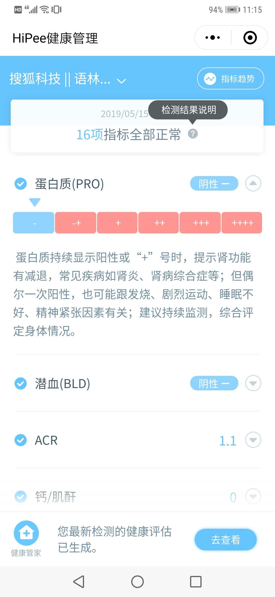 HiPee S2型一共能检测16项指标(设备能测出14项,有2项是计算得出),针对这16项指标的具体解释,包括异常是由于什么原因导致的,有什么疾病的风险,都阐述的非常清楚易懂。