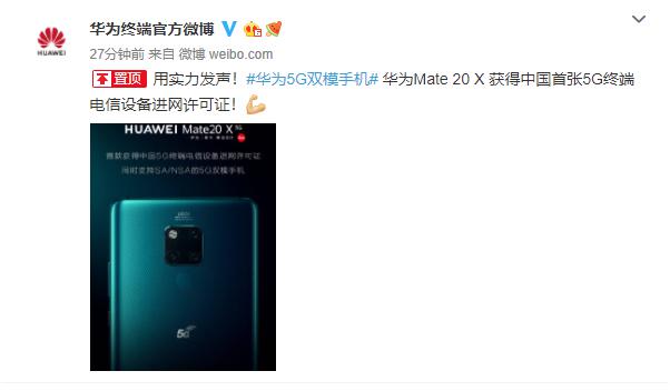 华为Mate 20 X(5G)获中国首张5G终端进网许可证