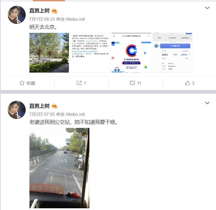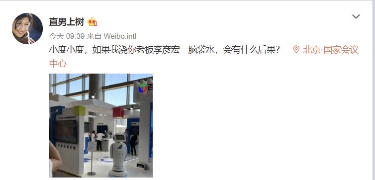 随后,有网友扒出疑似泼水者微博ID“直男上树”,此人曾在其微博直播其上京、入场以及准备上台的全过程,并展示了百度AI大会的购票信息以及从山西运城前往北京的火车票信息,订票信息显示其姓名为程某。