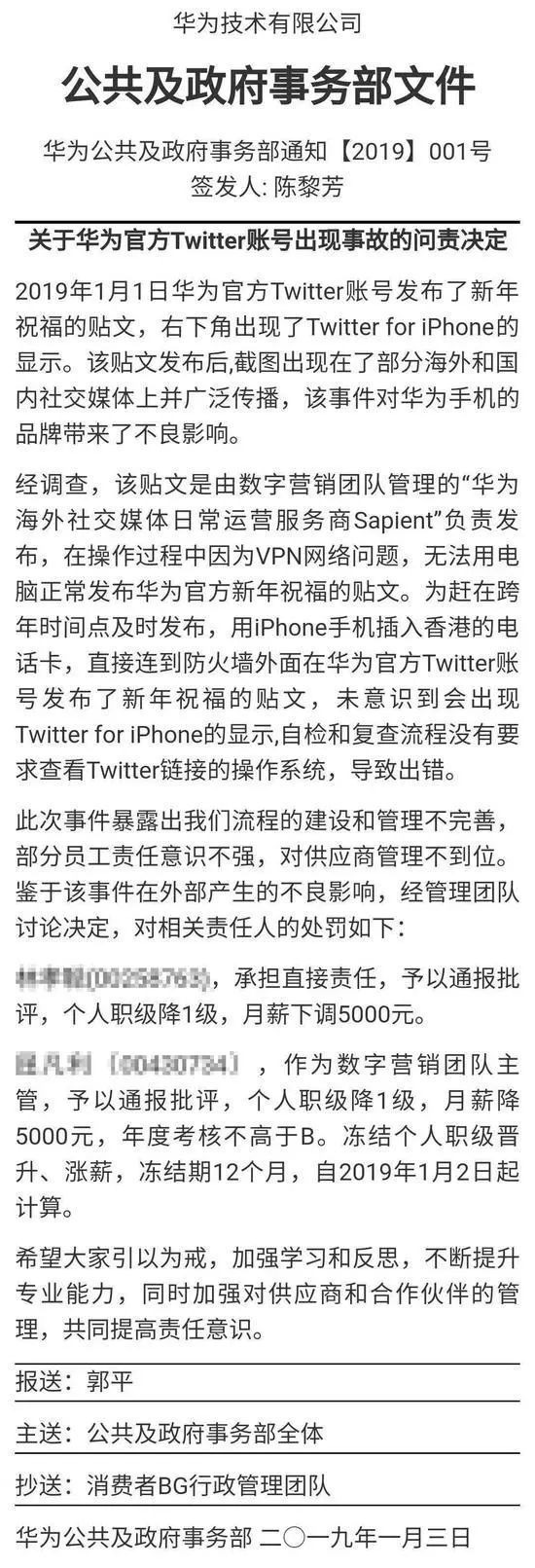 经调查,该贴文是由数字营销团队管理的“华为海外社交媒体日常运营服务商Sapient”负责发布,在操作过程中因为VPN网络问题,无法用电脑正常发布华为官方新年祝福的贴文。为赶在跨年时间点及时发布,用iPhone手机插入香港的电话卡,直接连到防火墙外面在华为官方Twitter账号发布了新年祝福的贴文,未意识到会出现Twitter for iPhone的显示,自检和复查流程没有要求查看Twitterf链接的操作系统,导致出错。