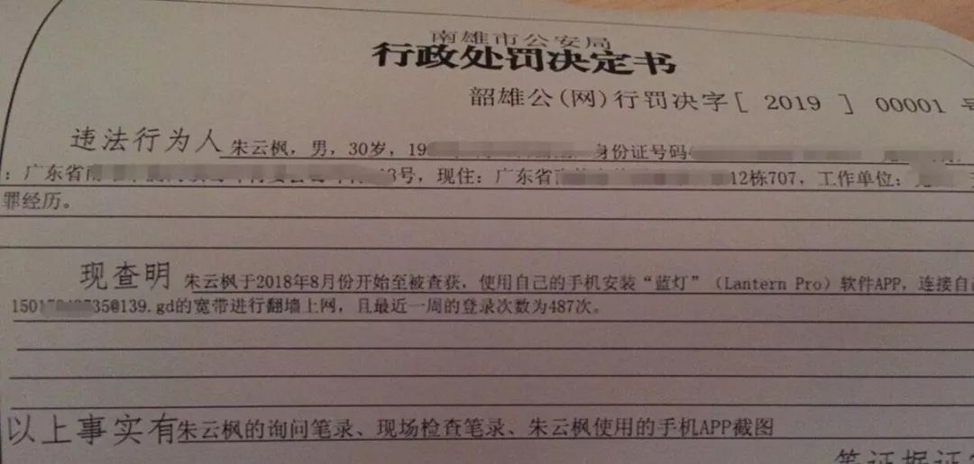 根据行政处罚决定书的截图显示,30岁的朱云枫因自2018年8月至12月,使用自己的手机安装蓝灯(Lantern Pro)翻墙软件APP,连接自己的宽带进行翻墙上网而被罚款1000元,其最近一周的登陆次数为487次。
