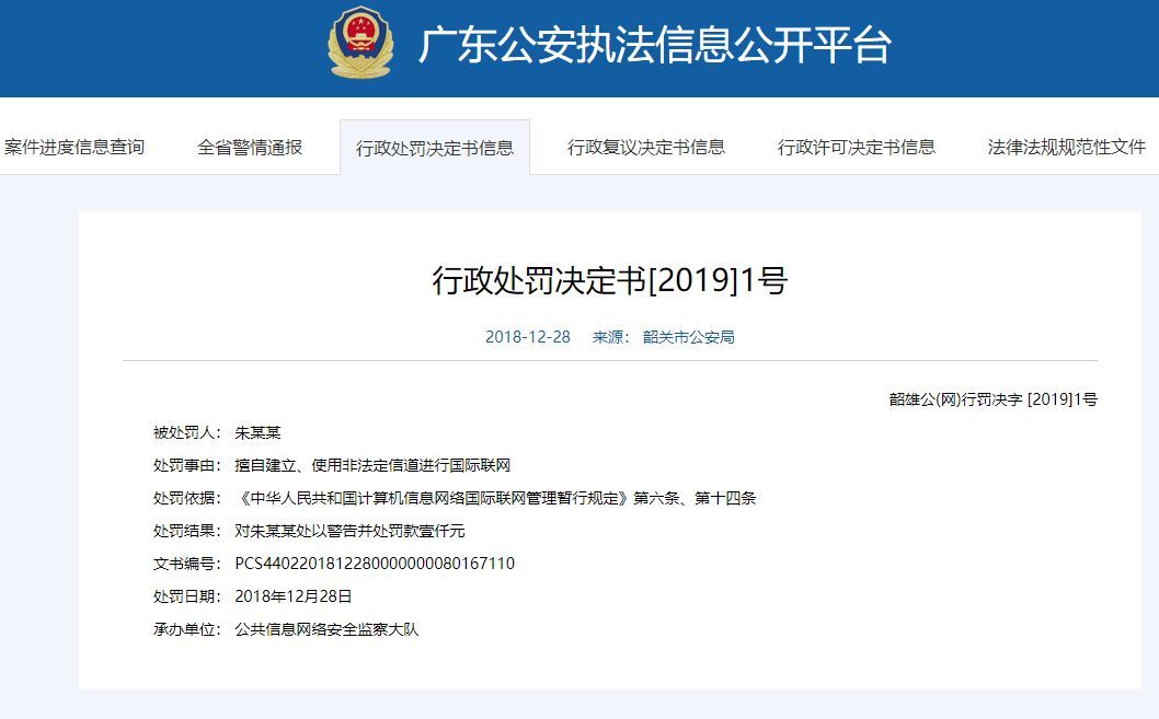 根据广东公安执法信息公开平台显示,2019年广东公共信息网络安全监察大队开出了第一张处罚决定书,行政处罚决定书上的信息显示,韶关市一位网民因“擅自建立、使用非法定信道进行国际联网”而被“处以警告并处罚款壹仟元”,这可能是首例因网民翻墙而被处罚的案例。