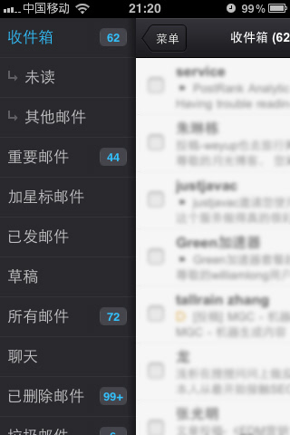 既然Gmail的IMAP端口没被封,那么理论上任何第三方iOS邮件客户端都可以通过IMAP访问Gmail,经过我的测试,国内主要的邮件APP(例如和)都能正常通过IMAP访问Gmail邮箱,不过邮件搜索功能还是不太正常。从国内的第三方邮件系统上访问Gmail,普通网民玩玩可以,对于国内公共知识分子,还是建议使用iOS内置的邮件系统,原因你懂的。