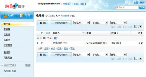 当时注册163网的时候,电信局会自动分给用户一个电信局的电子邮件帐号,容量好像只有10M左右,用户通常使用Outlook等软件将邮件下载到本地观看。当网易发布个人主页后,自带了一个免费邮箱服务,能让人使用@nease.net的邮箱,后来我就大多使用网易的邮箱了。到现在我还拥有一个网易的免费信箱,并且现在依旧可以收到邮件(虽然大多都是垃圾邮件)。