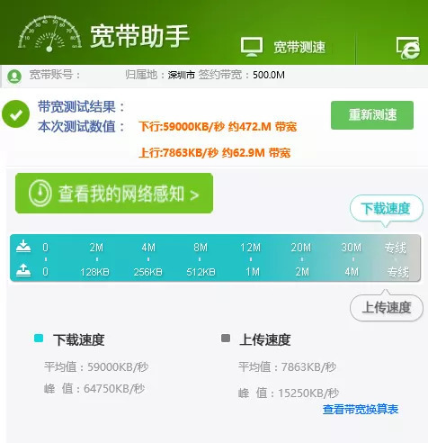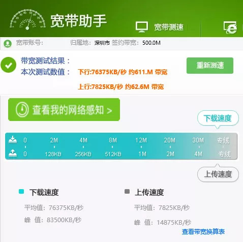 台式电脑用IE浏览器访问广东电信的宽带助手网站(网址是10000.gd.cn,这破网站只支持IE和Flash),网络环境选择“家庭有线”,经过测试发现宽带的确已经升级到了500M,测速显示,下载速度77.3MB/秒,约619M带宽,上传速度7.8MB/秒,约62M带宽。经过多测测试,下载速度和上传速度均比较稳定。