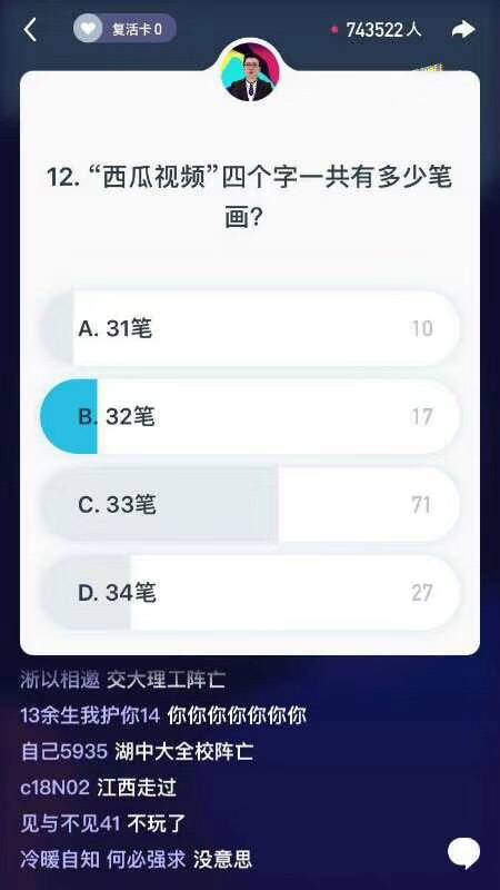 这里的一个值得关注的点是,芝士超人更多的传承了HQ的“轻知识”路线,问题更多的是偏娱乐性的,对大多数用户而言并不难,因此更容易参与进来。而今日头条的百万英雄,则在题目上有些尴尬。譬如,其最近的一个题目“‘西瓜视频’四个字一共有多少笔画”,这样的问题实在是不想把奖金分给用户啊。该场直播答题的结果也显示,只有23人通关,生生将大众游戏做成了小众,可谓是自己搬起了石头。