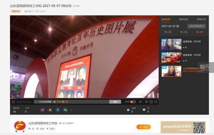 在斗鱼上,有很多ID中带有蓝翔二字的用户,其中可信度最高的是一个叫“山东蓝翔高级技工学校”的主播,他的直播中多次出现蓝翔校内场景。这名主播的直播次数有15次,总播放次数有1016次,关注者2820人,上一次直播是在今年5月7号,内容为蓝翔参加的一次名叫“中华职业教育社百年历史图片展”的活动。