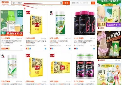 我们拿减肥的产品来举例。比如最近淘宝排名靠前的,投放付费广告的产品。