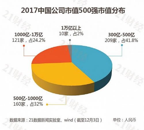 21数据新闻实验室选择在上海、深圳、香港、纽约等全球15个交易所上市的所有中国公司,对它们的最新市值进行加总换汇计算,得出“2017中国上市公司市值500强榜单”。