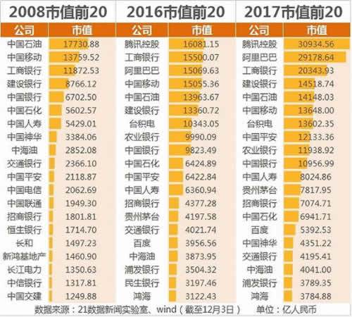 值得一提的是,这也是十年来首次,互联网科技公司包揽前两名。而在2008年至2014年,中国石油一直雄踞市值榜首,占据第二名的基本是工商银行;2015年则由工商银行、中国移动领先。