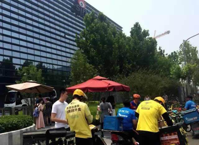 午餐时间在新浪大楼下等候的外卖骑手。 图/AI财经社 袁琳