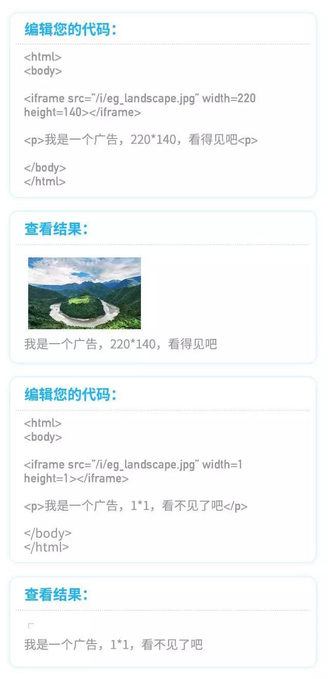 iframe是一个HTML标签,可以在当前页面中插入其他页面的内容,常常被用来作为承载展示广告的载体。iframe有诸多属性可以设置,其中最为广告人喜爱的莫过于宽度width和高度height了。通过对这两个参数的设置,可以将广告尺寸从肉眼可见的220*140变成不可见的1*1。不就改了一个大小嘛,这算什么作弊呢?各位,大小改了之后,虽然你看不见,但检测代码看见了呀,这是一次正常的广告展示,可以向广告主收钱了。可见,作弊者对我们广大用户还是有一颗怜悯之心的:我就挣广告主的钱,向借您一个像素点,广告不会显出来,不影响您正常上网。这不正印证了那句老话嘛:“不打扰,是我的温柔”。
