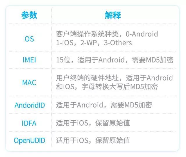 监测代码是指那些具有客户端信息收集功能的代码。它的主要工作,是将客户端的信息以参数的形式拼凑成URL,并以HTTP请求的方式传给第三方,告知“谁,在什么时候,看到了来自哪个媒体展示的,哪个广告主的广告”。以移动端为例,常见的客户端参数有如下几种(数据来自《中华人民共和国广告行业标准》):