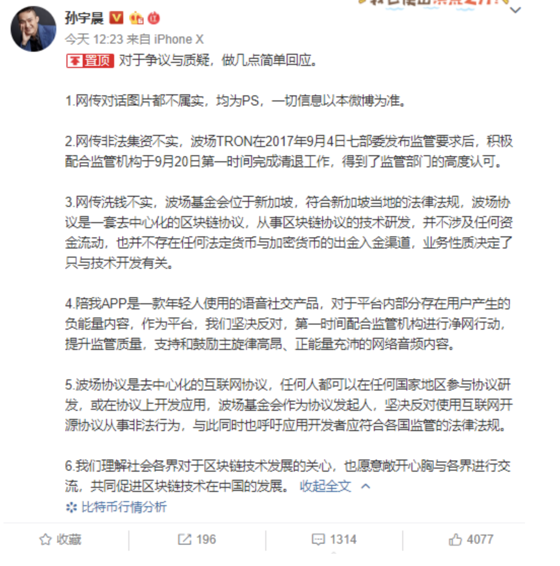 而关于涉嫌非法集资、洗钱、参与涉黄、涉赌的报道,孙宇晨曾发微博一一反驳。