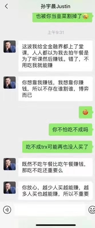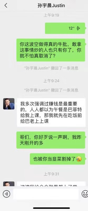自从6月4日宣布以456万美元(约人民币3142万元)天价成功竞拍巴菲特午餐以来,孙宇晨的表现一直十分高调:怼王思聪、怼搜狗CEO王小川、宣称拿出1000万支持小鹏汽车消费者维权,邀请不看好比特币的美国总统特朗普参加巴菲特午餐。随着孙宇晨言行不断引起热议,人们对其“碰瓷”的质疑声也越来越大。在取消巴菲特午餐之后,有疑似孙宇晨声称要“给巴老上上课”、“既然不吃午餐比吃午餐赚钱,那吃不吃还重要么”的微信对话流出。不过随后孙宇晨否认了截图真实性。