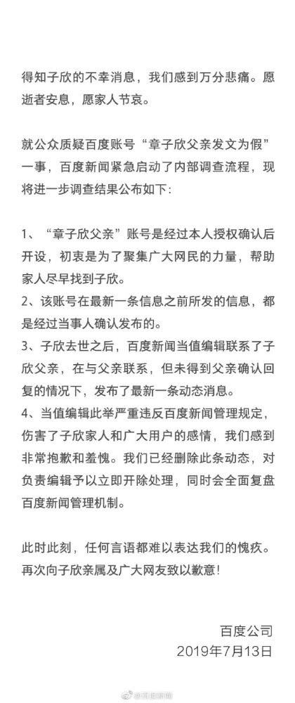 7月13日晚上21点30分,经过详细调查后的百度再次更新了回应,承认了章子欣父亲发文为假的事实。并删除此条动态,对负责编辑予以立即开除处理,同时会全面复盘百度新闻管理机制。
