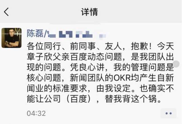 7月14日,百度新闻负责人陈磊在微信朋友圈再次致歉称:“各位同行、前同事、友人,抱歉!今天章子欣父亲百度动态问题,是我团队出现的问题。凭良心讲,我的管理问题是核心问题,新闻团队的OKR均产生自新闻业的标准要求,由我设定。也确实不能让公司(百度),替我背这个锅。”