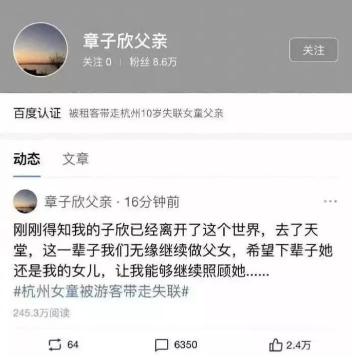 7月13日下午,疑似杭州9岁失联女孩章子欣的遗体被发现,这是一位由百度账号官方认证的名为“章子欣父亲”的账号发文称:“刚刚得知我的子欣已经离开了这个世界,去了天堂,这一辈子我们无缘继续做父女,希望下辈子她还是我的女儿,让我能够继续照顾她......”