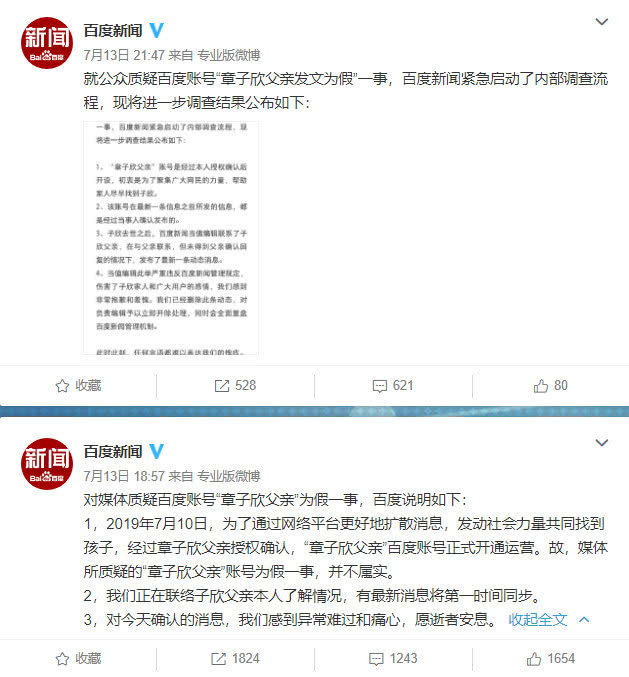 7月13日晚间,@百度新闻官方微博公开回应,但回应的结论是“账号造假一事并不存在”。百度称,2019年7月10日,为了通过网络平台更好地扩散消息,发动社会力量共同找到孩子,经过章子欣父亲授权确认,“章子欣父亲”百度账号正式开通运营。故,媒体所质疑的“章子欣父亲”账号为假一事,并不属实,同时他们正在联络子欣父亲本人了解情况,有最新消息将第一时间同步。