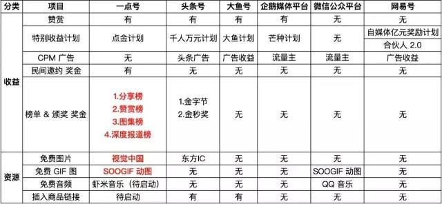 大家请看一位自媒体人统计的表格。包括一点资讯的一点号、今日头条的头条号、网易的网易号、UC的大鱼号、企鹅的自媒体平台,以及微信号。通过这张表格,你可以看到,平台给自媒体人带来了哪些利益。