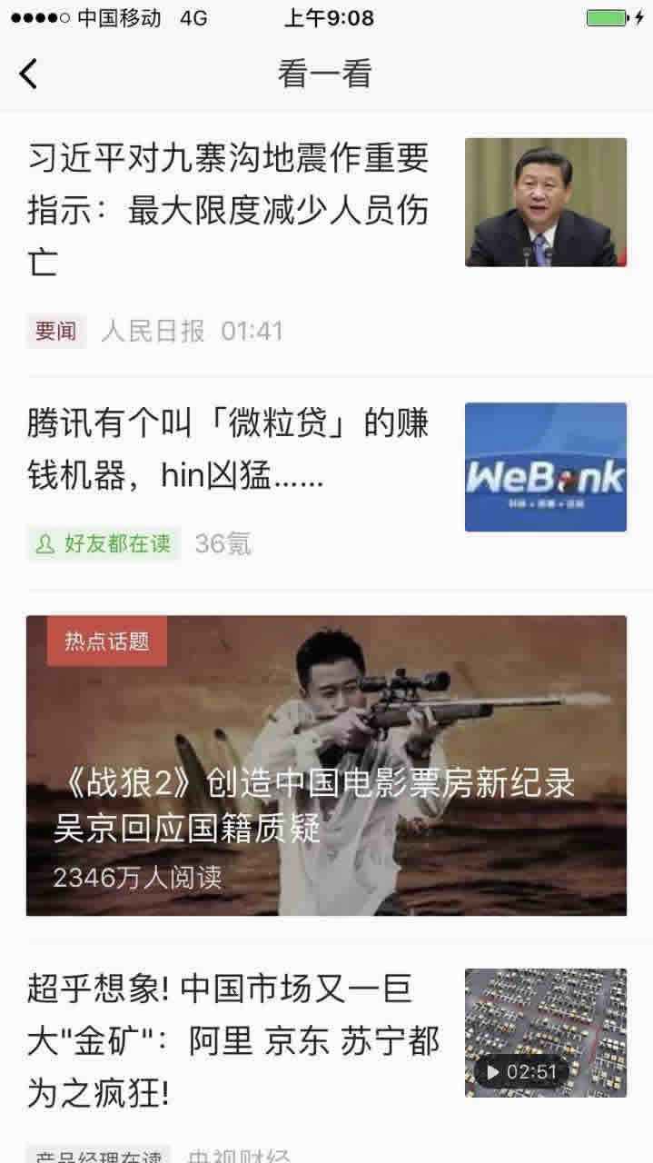 而在两个月前,“朋友圈热文”已经改头换面为“看一看”。入口变浅并覆盖全体用户,“微信头条”的功能已经初具规模。