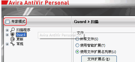 6、点击“配置”,可以对Avira AntiVir Personal进行相关设置,一般地默认的设置就可以了。另外还有一个强大的“专家模式”,如下图: