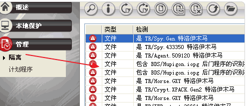 5、“管理”里的“隔离”可以看到发现病毒木马的报告信息,如下图: