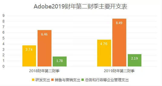 Adobe经营成本不断提升体现在各个方面。在研发支出上,Adobe第二财季共支出4.76亿美元,较上一财年同期3.74亿美元增长27.27%;在销售与营销支出上,本财季成本支出为8.49亿美元,与上与财年同期6.46亿美元相比,增长了31.42%;而在总务和行政等企业管理支出上,Adobe的费用也在增长,由2018财年第二财季的1.78亿美元增长至2019年第二财季的2.19亿美元。