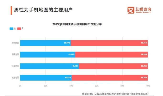 据艾媒北极星互联网产品分析系统(bjx.iimedia.cn)数据显示,2019年第一季度,搜狗地图、腾讯地图、百度地图、高德地图的男性用户占比分别为60.31%、56.85%、53.88%、59.56%。