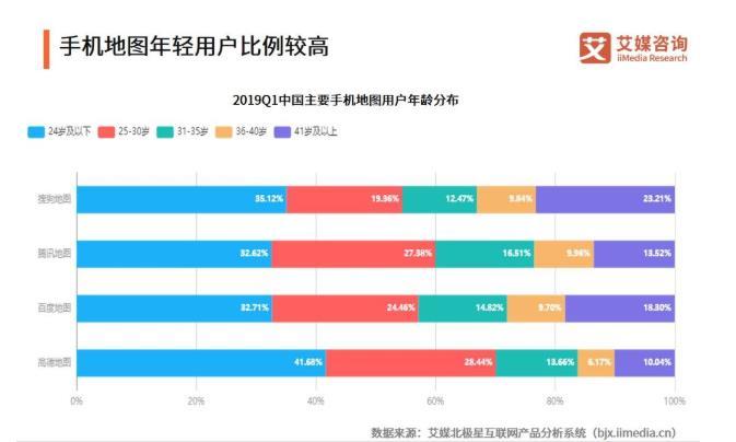 从年龄方面来看,搜狗地图、腾讯地图、百度地图、高德地图的24岁及以下用户比例分别为35.12%、32.62%、32.71%、41.68%。