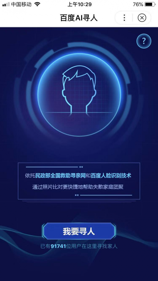 依托百度强大的图片识别技术,“百度AI寻人”智能小程序只需用户上传一张照片,就能与民政部全国救助寻亲网的数万条走失人口数据进行一键比对。